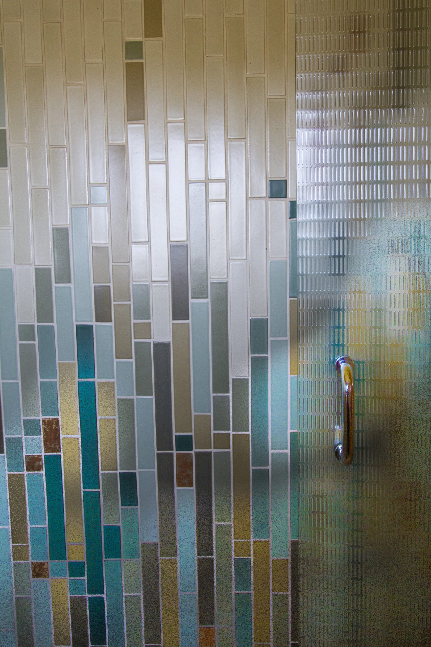 The inspiration of the Japanese bath wall designs shown in the above photo, came from the grassy hill outside the window of the soaking tub in the Fong house. Interior meets exterior using fifteen colors and ten sizes of 2″ tile. Thank goodness for expansive product lines.